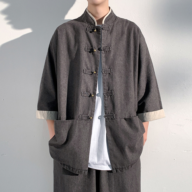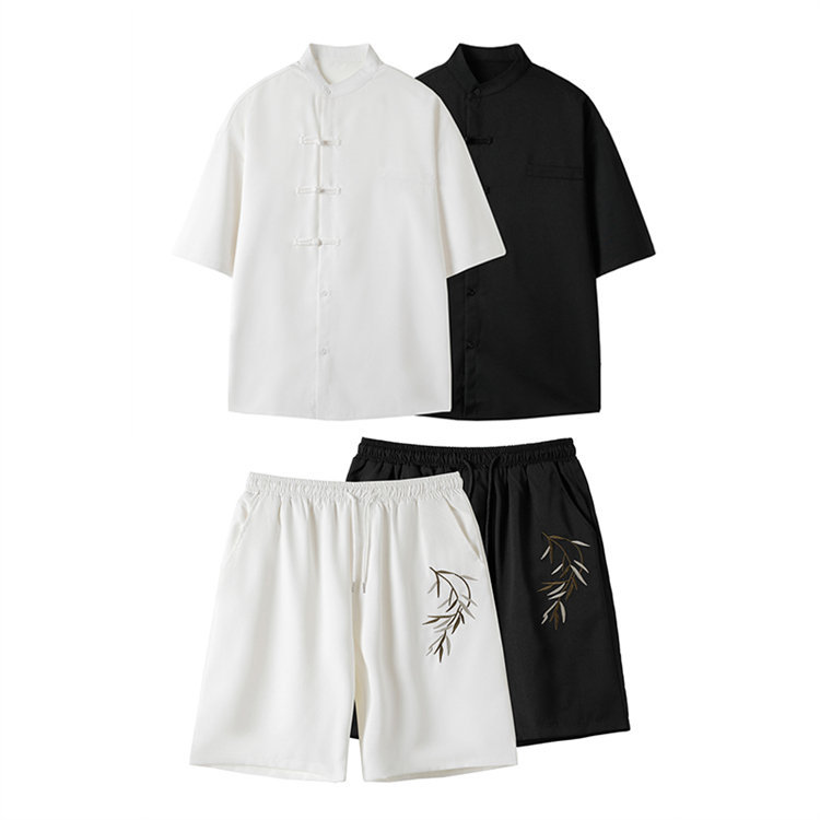 2024夏の新型男性立襟盤ボタン刺繍新中国風シャツパンツセット男性カジュアル2点セット