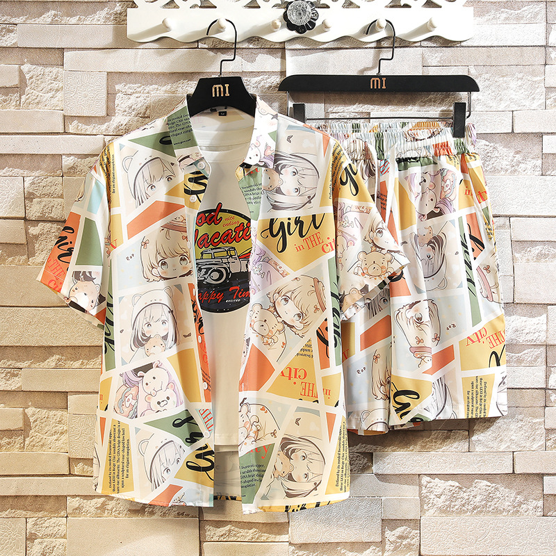 2024春夏クロスボーダーメンズカジュアル大きいサイズビーチアイスシャツ半袖カップルスーツビーチパンツスーツ男