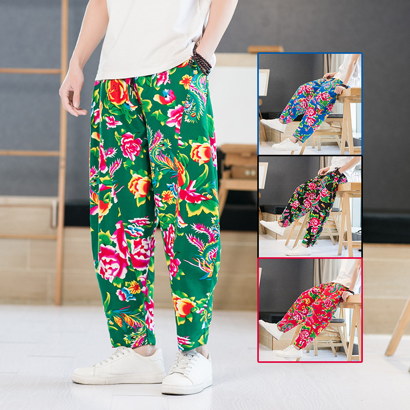 2023春秋男性中国風東北大花ゆるいズボン九分民族特色牡丹花カジュアルパンツ