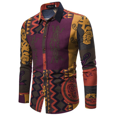 2023春秋新作メンズ綿麻民族風花柄プリントメンズカジュアル長袖ファッションビッグシャツ