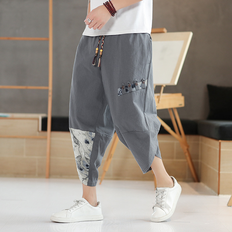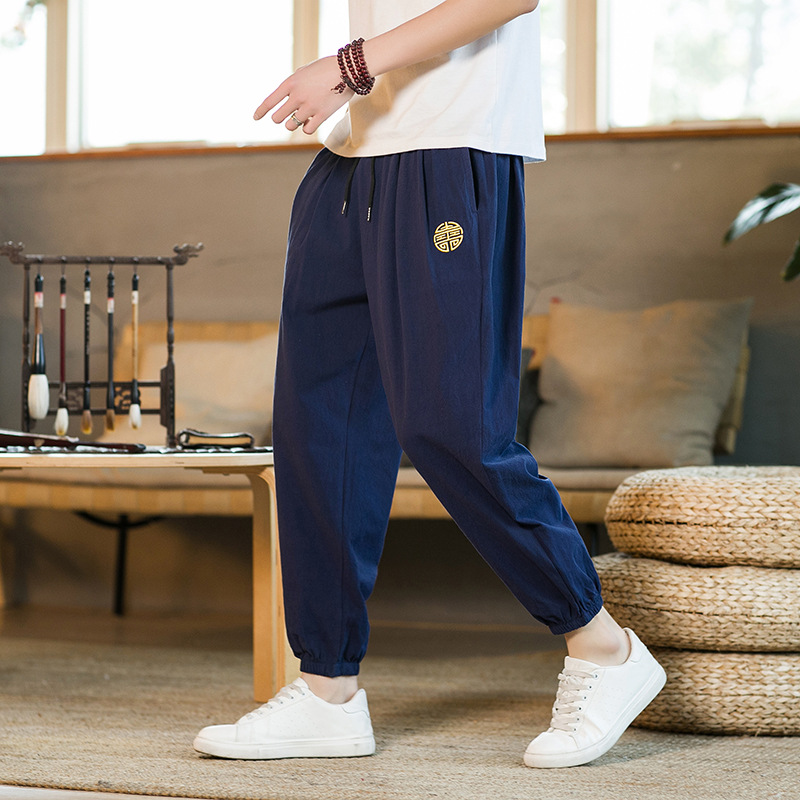 2023クロスボーダー男性中国風綿麻ゆったり九分ズボンハーレムズボン大きいサイズ刺繍束足カジュアルパンツ