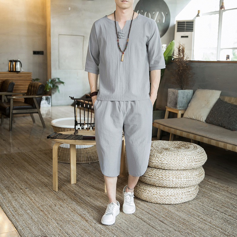 2023速売通男性夏綿麻セット七分袖七分ズボン盤ボタン純色綿麻セット