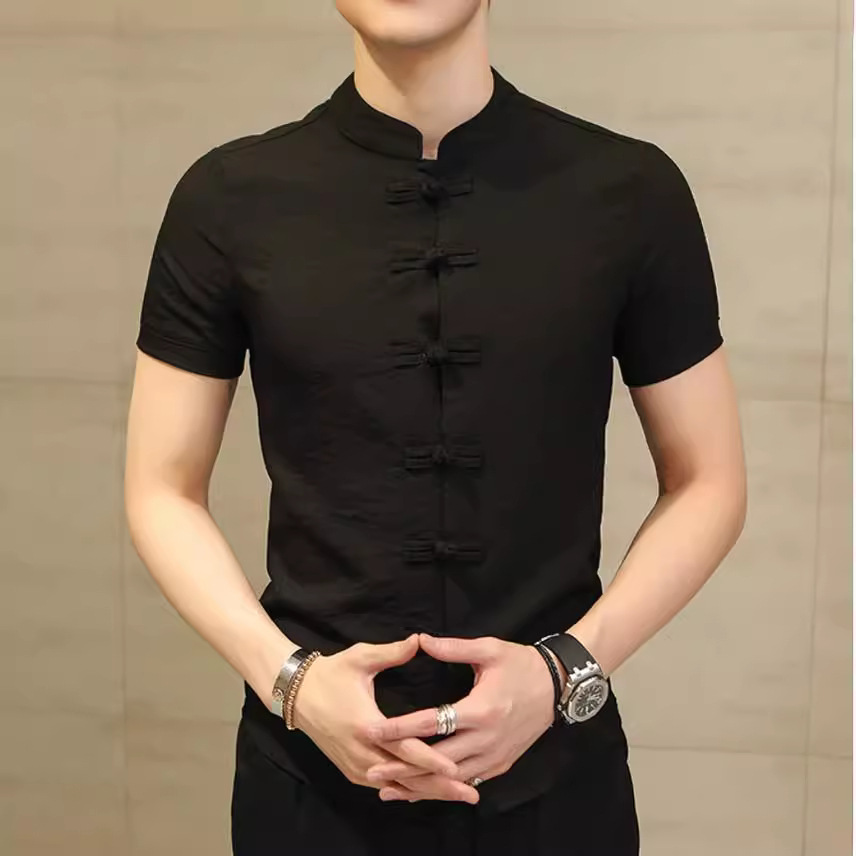 2024年夏新作 メンズ 中国風 留め具付き 無地 半袖シャツ 韓国風 スリムフィット メンズ カジュアルシャツ