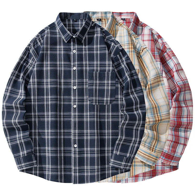 2025ファッション日系男性服レトロ格子長袖シャツ男性ゆるいカジュアルシャツ上着