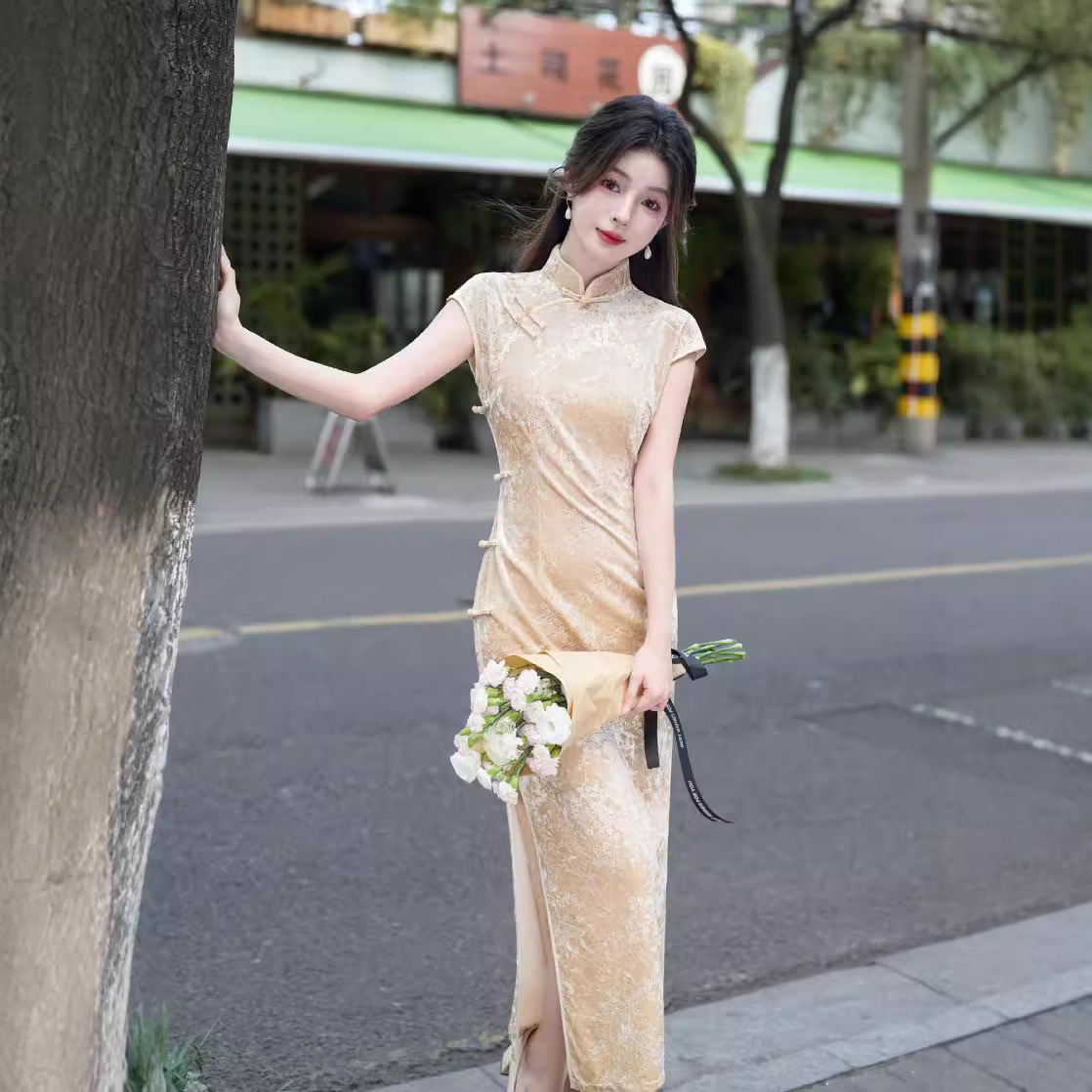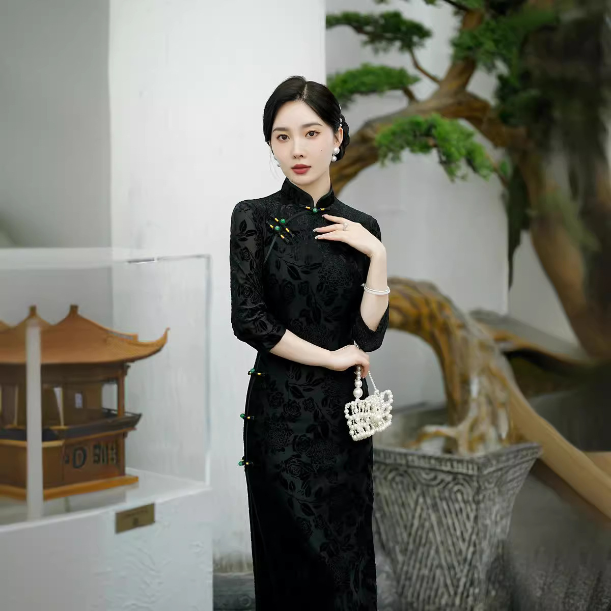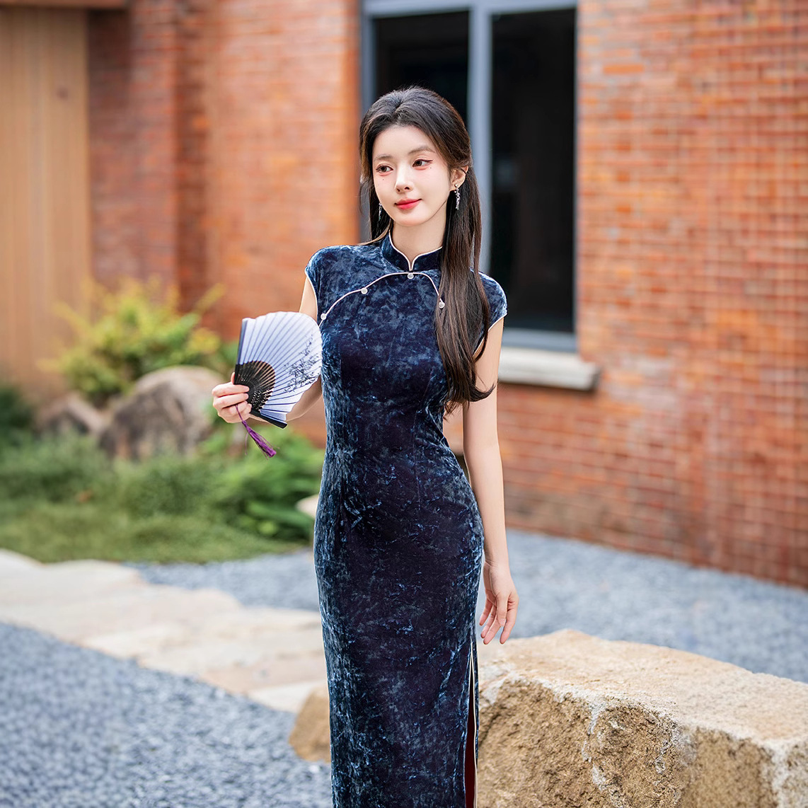 2023秋のベルベットの単層チャイナドレスのレトロな長い母親のチャイナドレスの改良ファッションチャイナドレスの卸売り