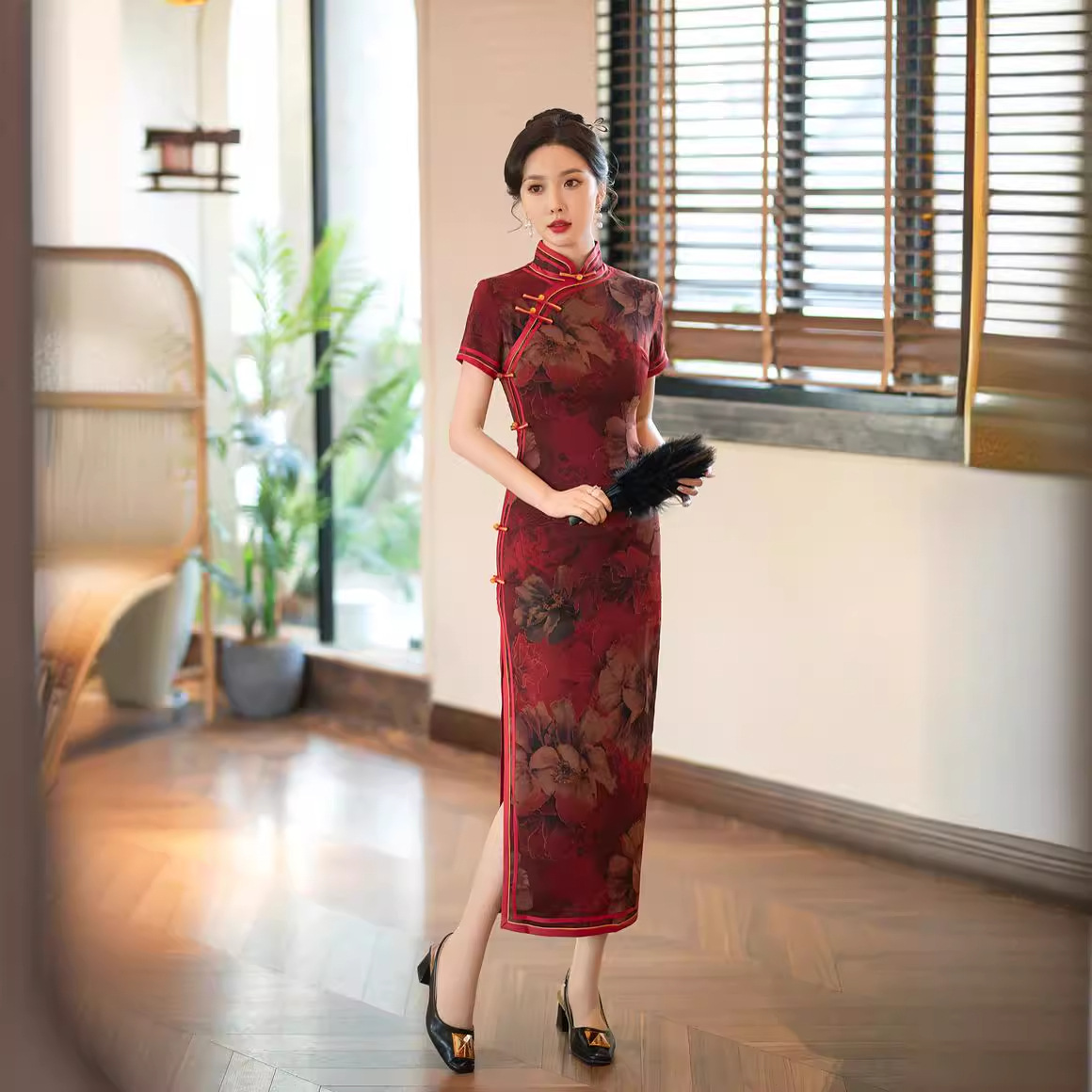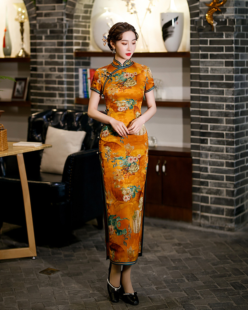 花羅サテンチャイナドレス2023新作春の女性気質レトロ日常改良民国風ロング丈修身チャイナドレス