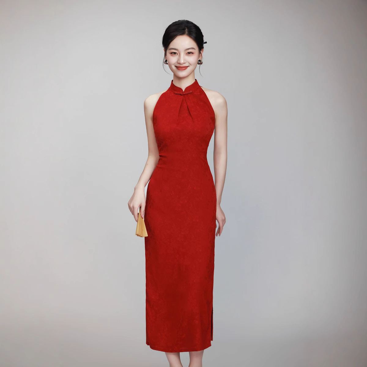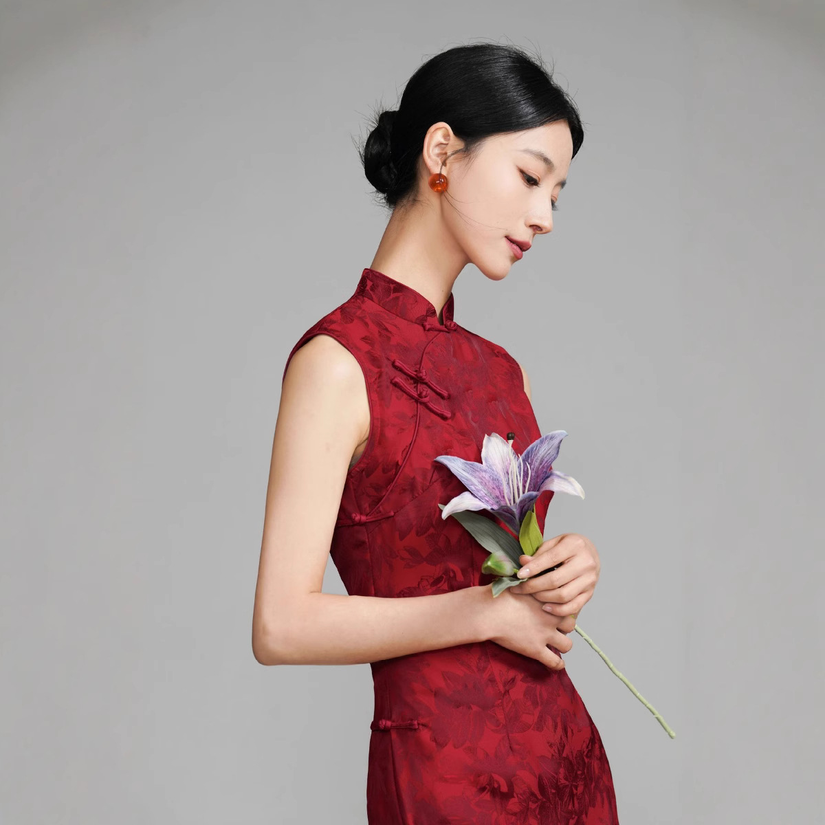 2025新中国式チャイナドレス、袖なしの高級気質レトロな赤い敬酒服