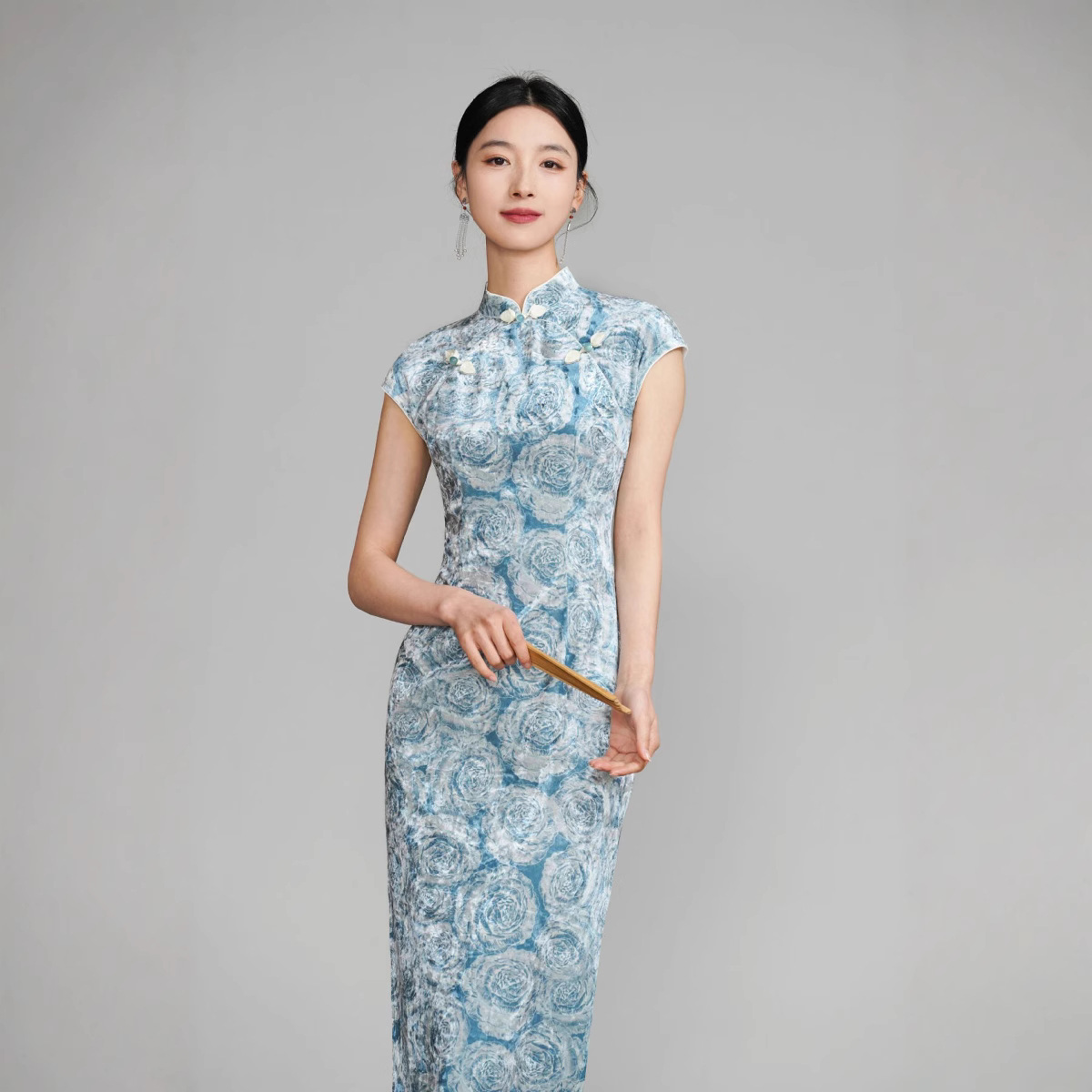 美ローラン2025春夏新作ブルー改良新中国式チャイナドレス