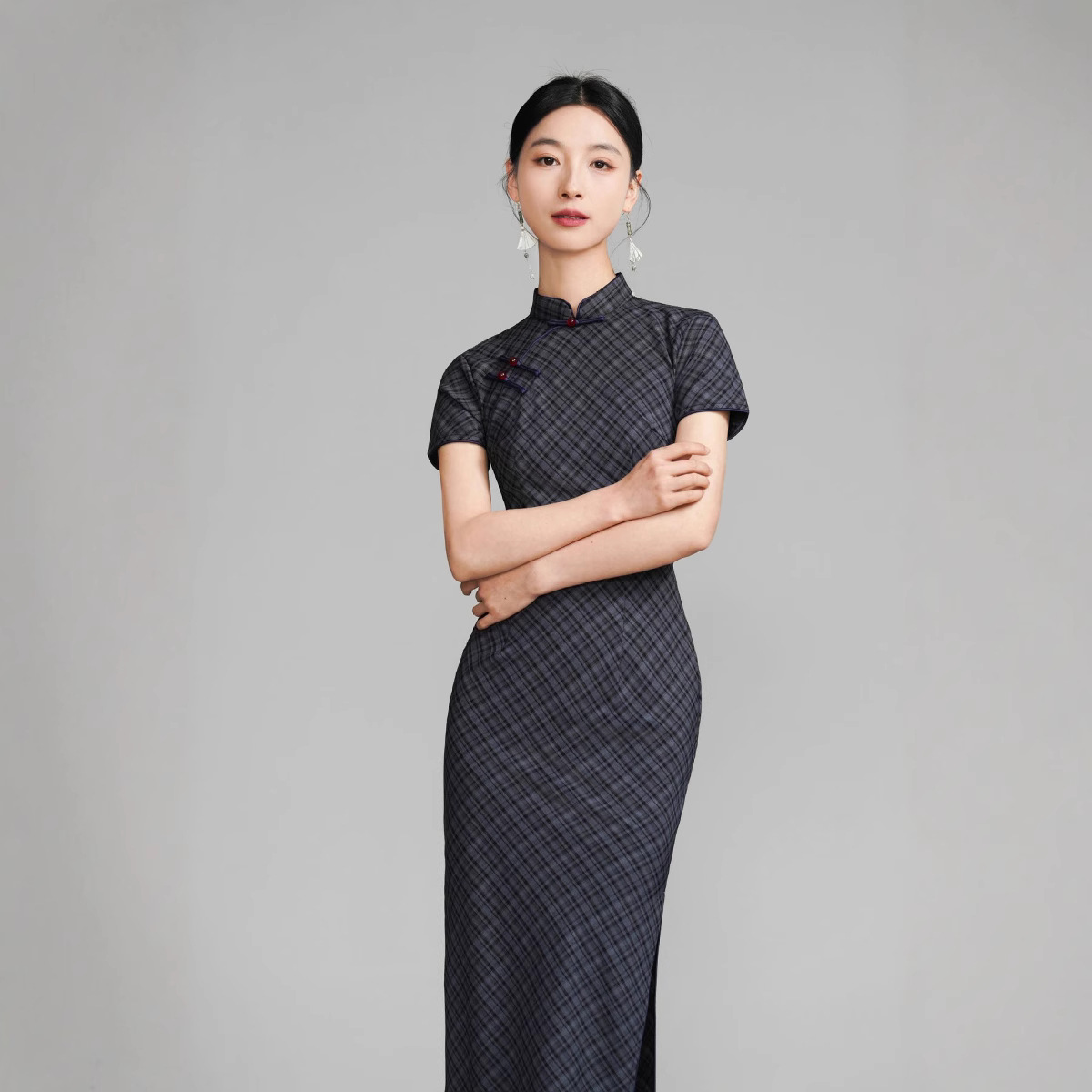美ローラン復古国風長型シャトル織り格子半袖チャイナドレス2025春夏新作古い上海文芸チャイナドレス