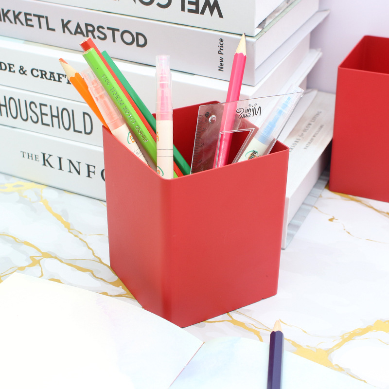 事務用品のシンプルな金属の四角形の筆立ての赤いデスクトップの収納筒の学生の文房具の贈り物はlogoを印刷することができます。