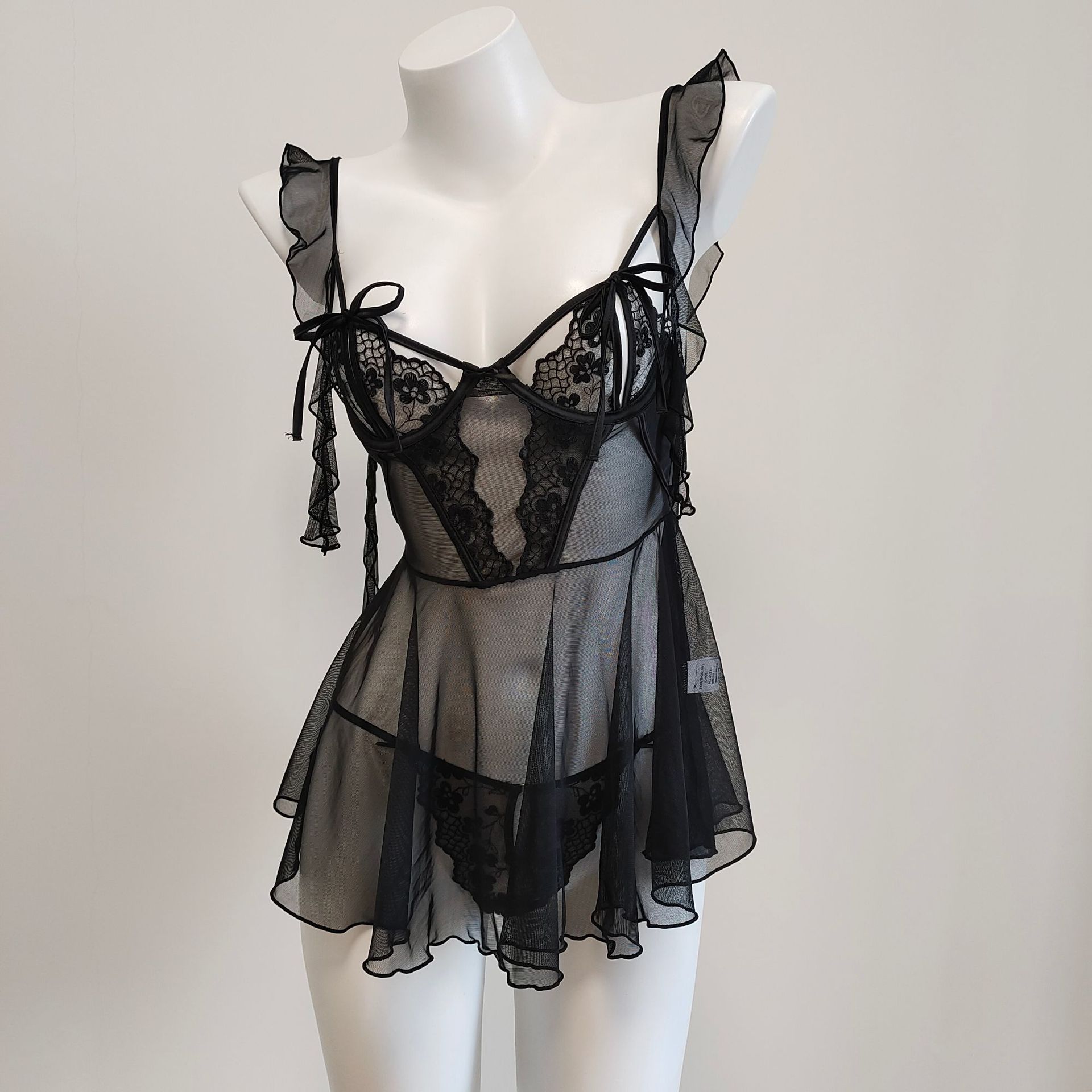 2025新型の前でフォークを開けてレースのセクシーなパジャマを誘惑します。
