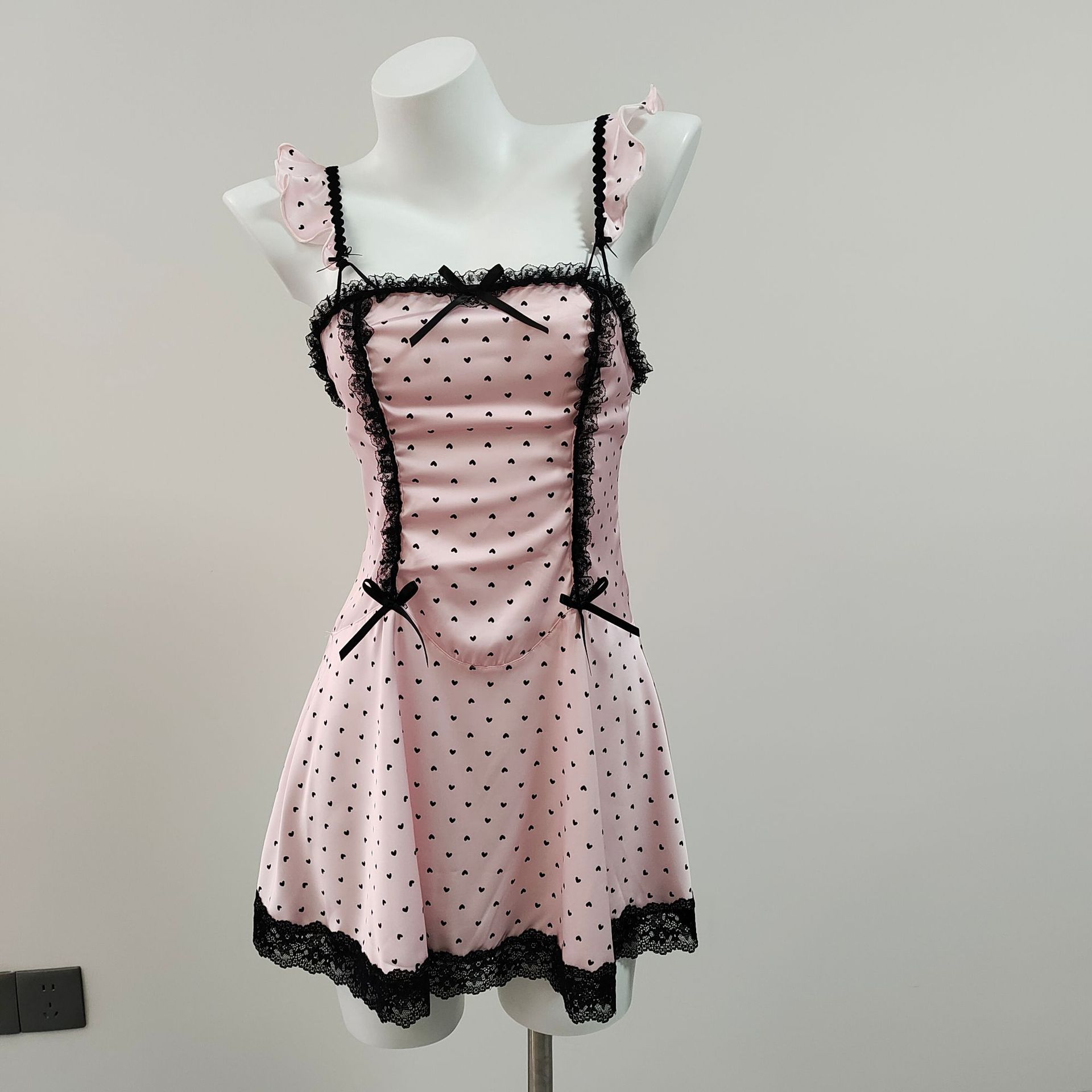 フレンチプリンセス風セクシーな胸パッド付きパジャマ、甘い水玉レースバックレスサスペンダーナイトガウン、ホームウェアナイトガウン