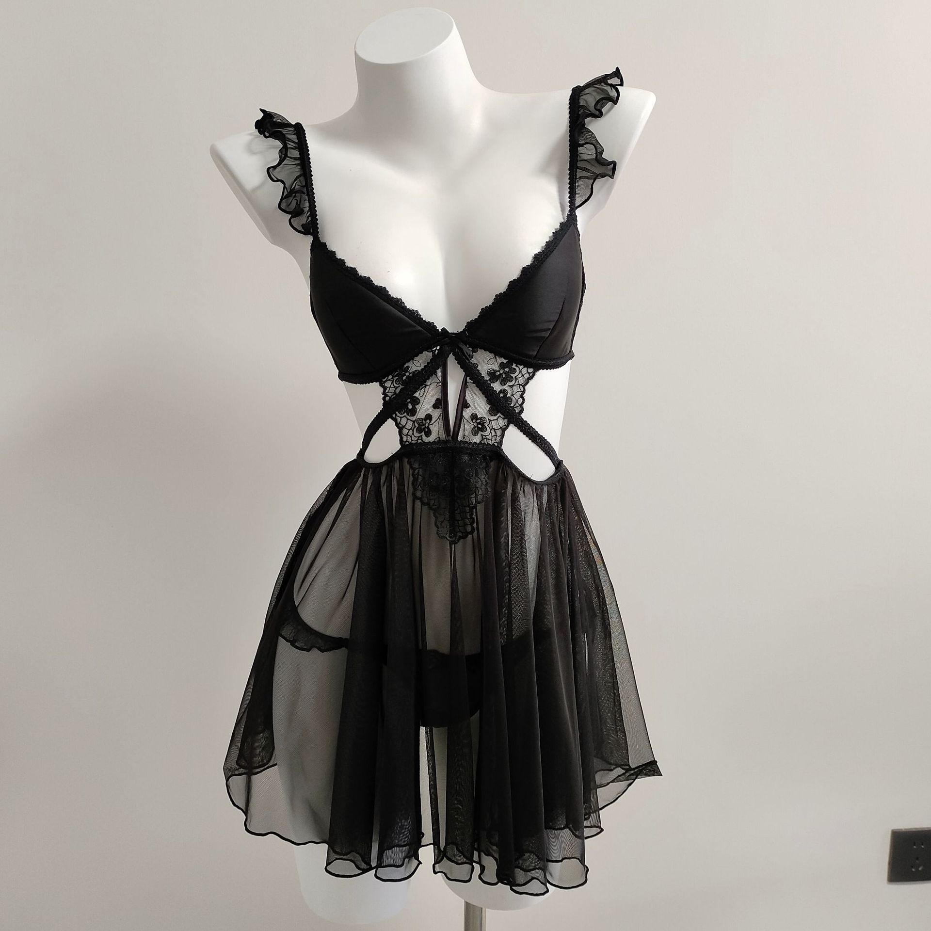 セクシーパジャマ胸パッド付き女性小胸網糸2024新純欲高級感レースストラップ寝スカートセット薄い
