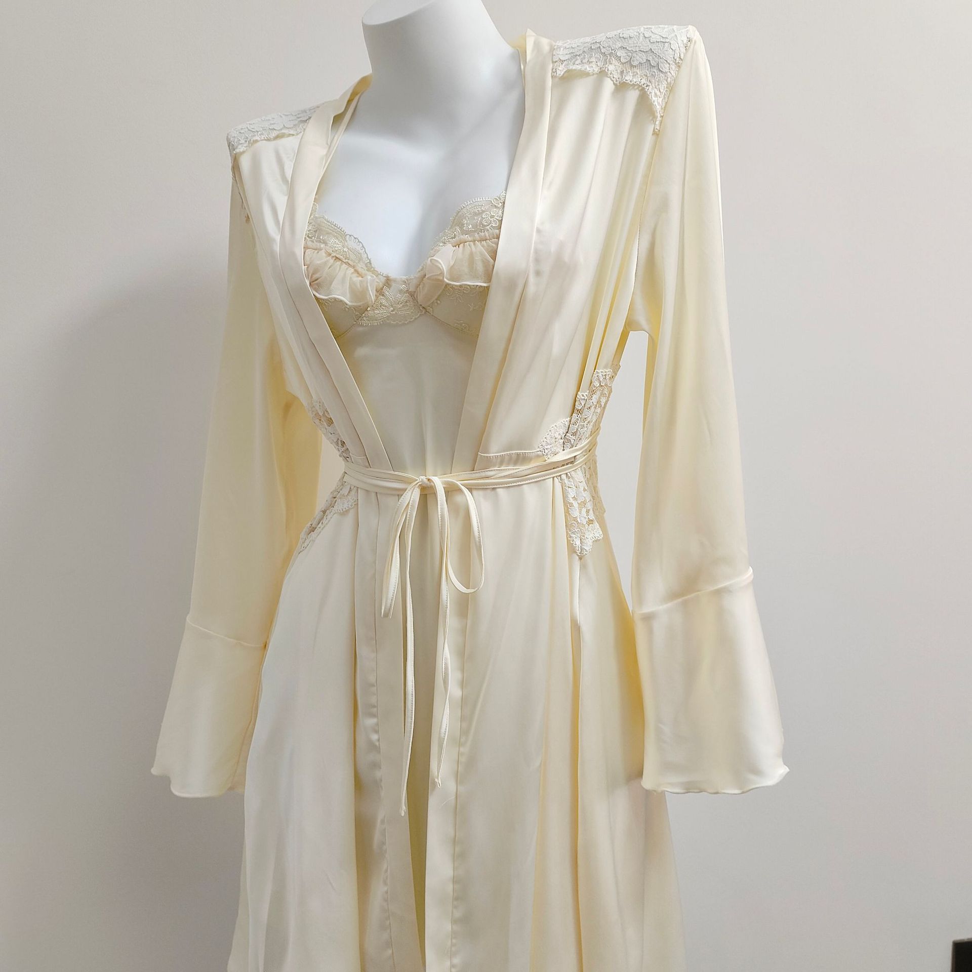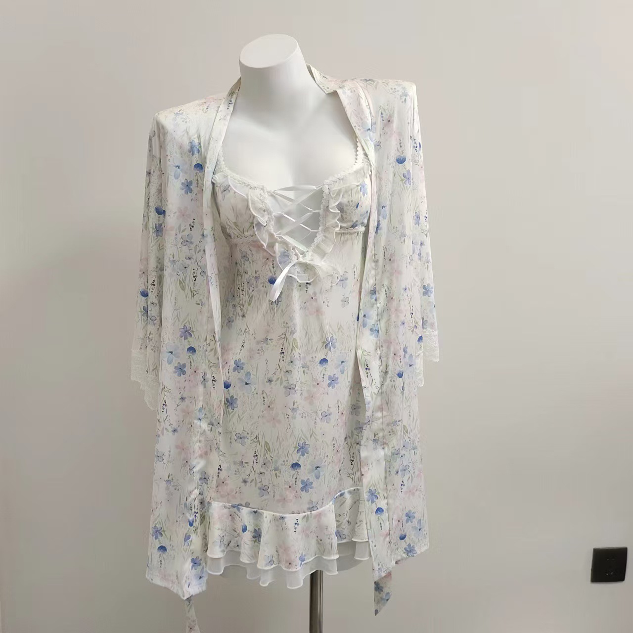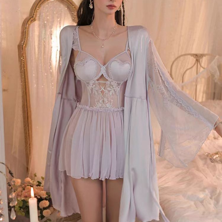 セクシーな寝衣の女性式の純粋な欲風の高級感の寝衣の2024新型の春と秋の氷の糸はレースのバスローブの朝の服をつなぎ合わせます。