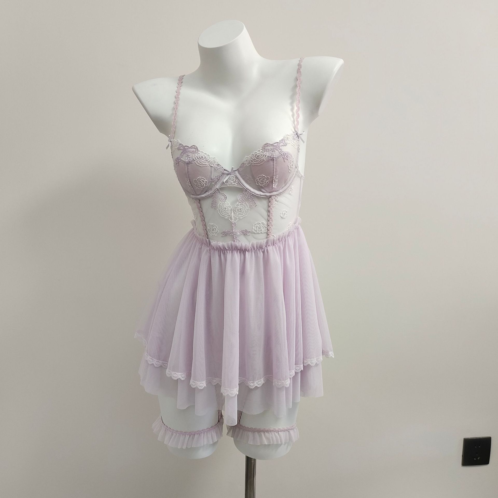 2024新型夏純欲小胸帯胸パッドレース刺繍ストラップ寝スカートセクシーネット糸ホーム服セット