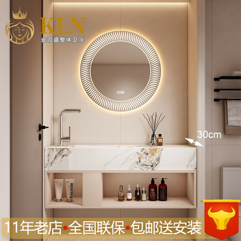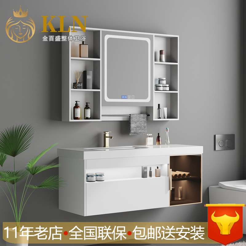 小戸型実木浴室キャビネットセット岩板カウンター知能除霧鏡サイド置物洗面台e27