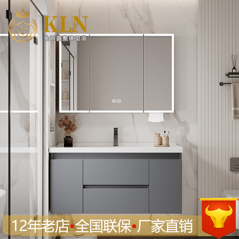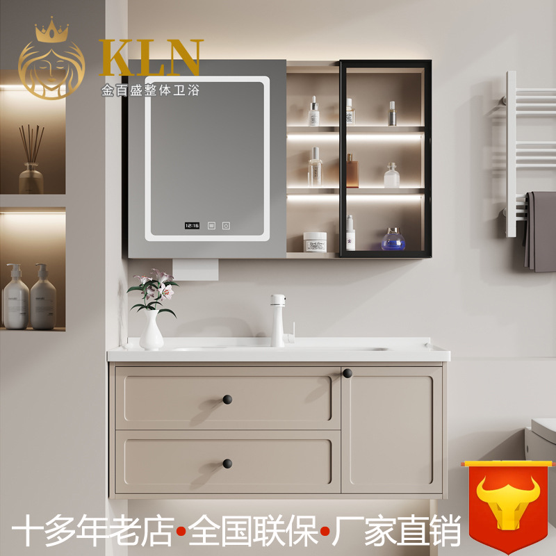 実木浴室キャビネットセット岩板カウンター知能除霧鏡感応灯洗面台金百盛風呂8086