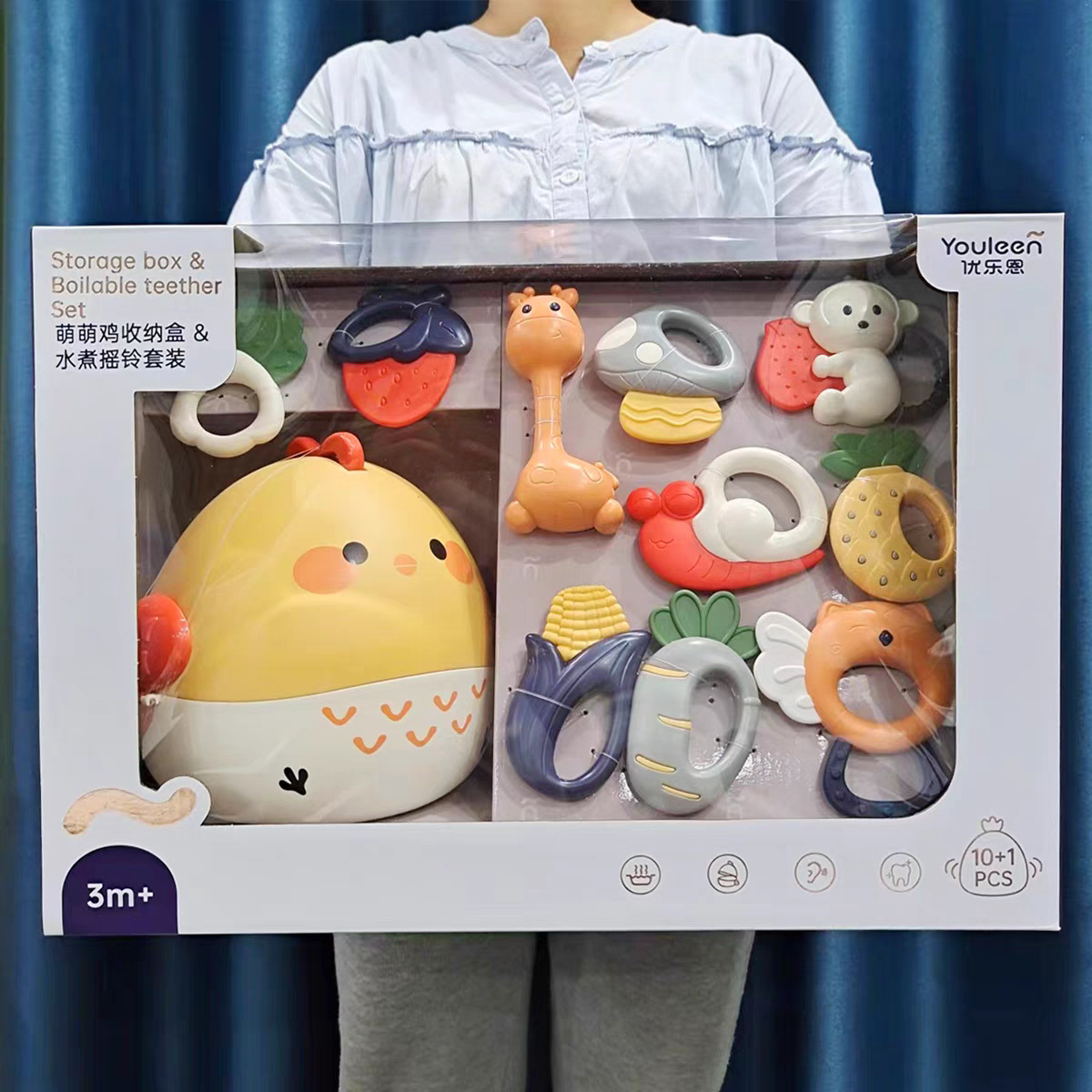 正規版の優楽恩の鈴のセットの歯のゴムの3-12月の新入生の赤ちゃんのプレゼントの満月の贈り物の萌えのニワトリは贈り物の箱をなだめます。