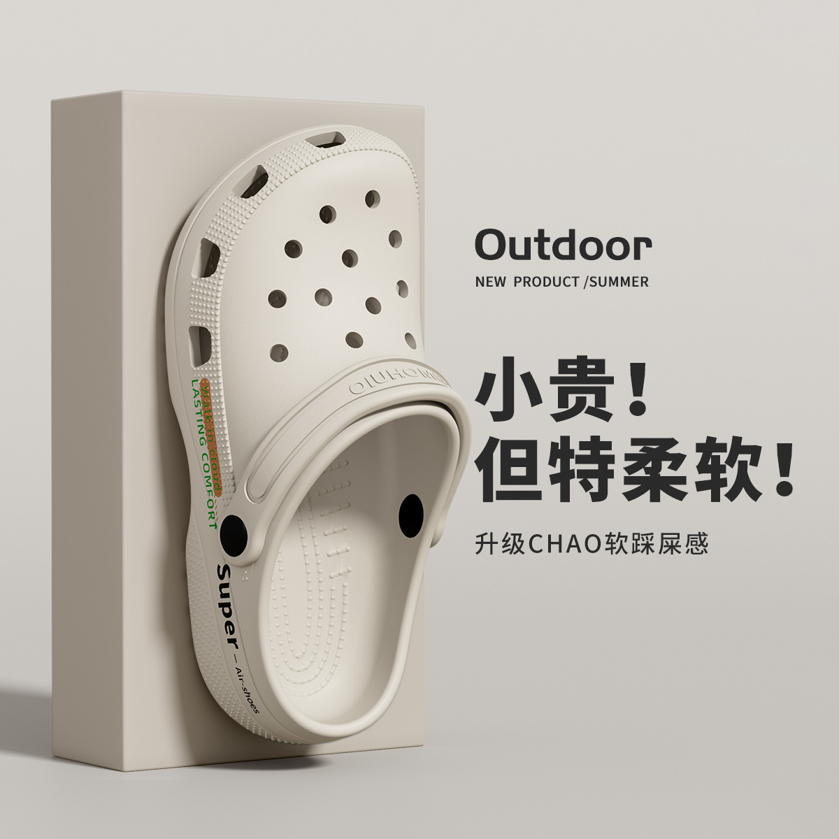 男性の洞靴は夏にビーチの屋外のパケットヘッダーのサンダルを着て、家の浴室で滑り止めの夏の厚い底で糞を踏む感がある