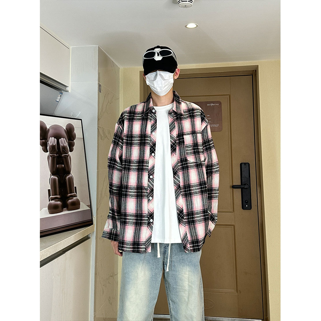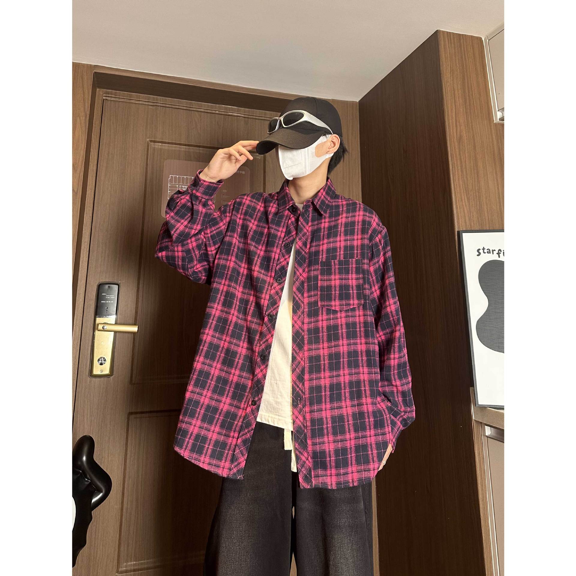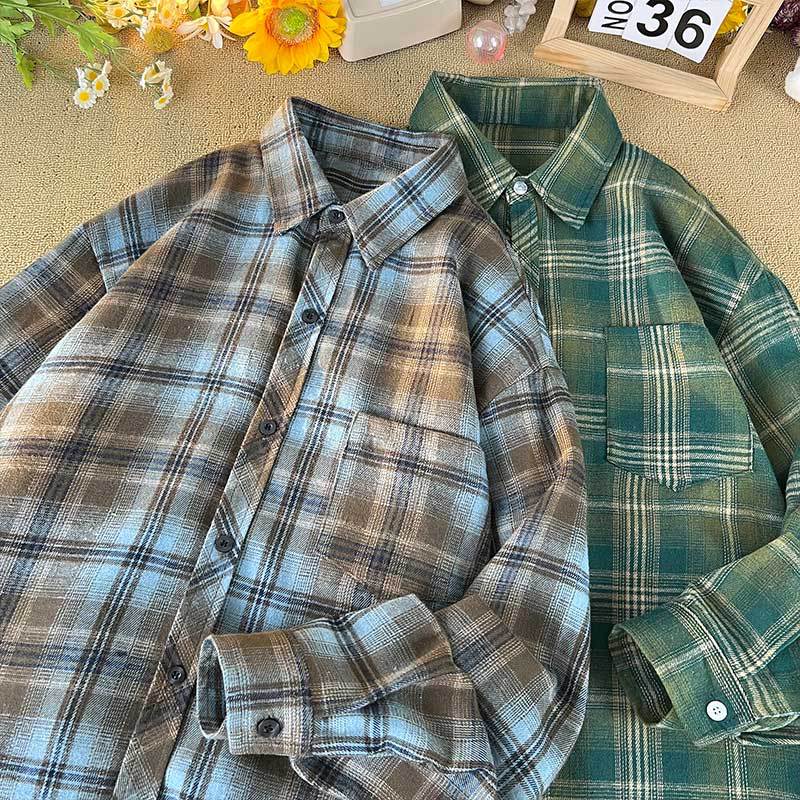 アメリカのレトロな格子のシャツの男性の秋の新型の襟をめくって袋の設計のカップルのゆったりした長袖のシャツのコートの女性を貼ります。