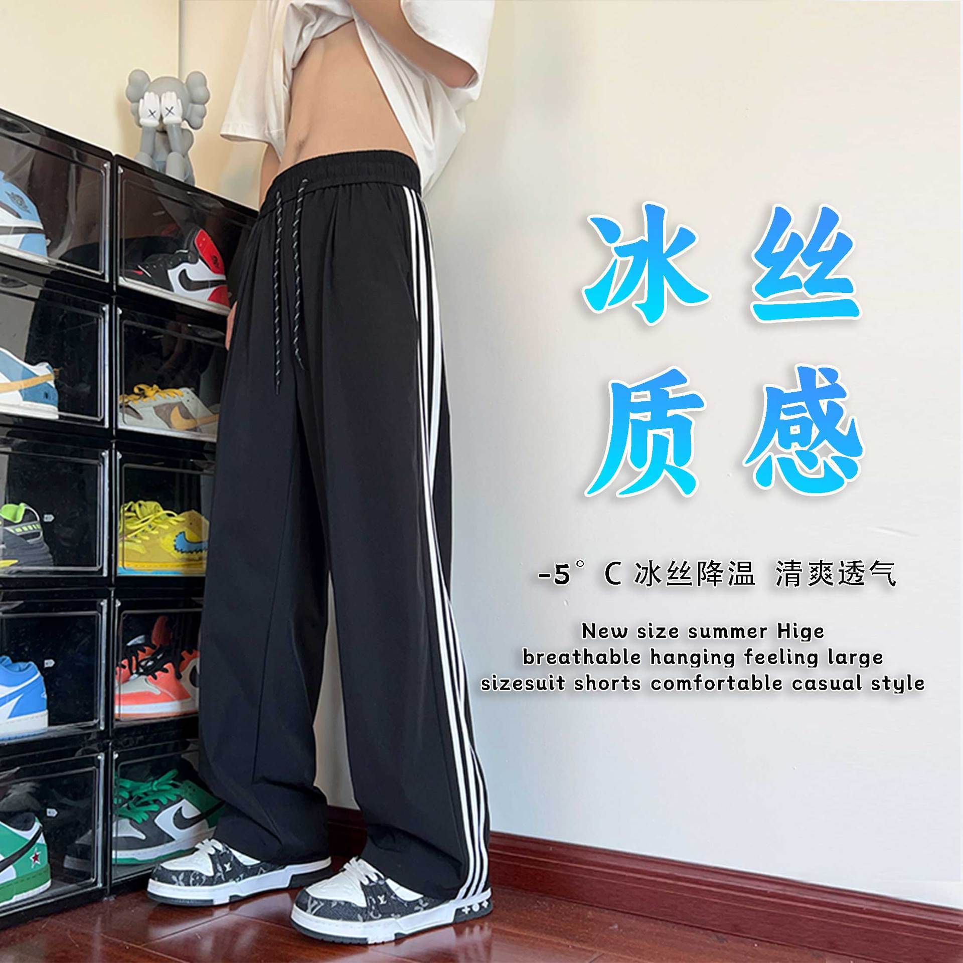 氷のズボンの夏の新型の薄いタイプの生地のナイロンの涼しさの広腿のズボンの3条の棒のゆったりしているストレートのカジュアルなズボン