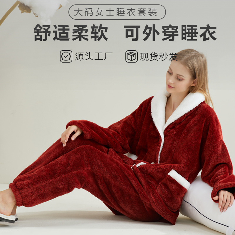 クロスボーダー冬パジャマ女性サンゴフリースパジャマ肥厚プラスサイズホームウェア女性ターンダウン襟ルーズレディースパジャマセット
