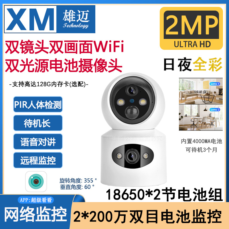 雄邁双画面低消費電力電池無線モニター360度室内家庭用フルカラー首振り機カメラ