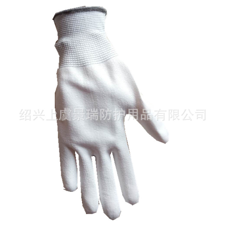 静電気防止通気性pu手袋白色puは滑り止め無塵手袋耐摩耗性通気性工業手袋の現物を指している