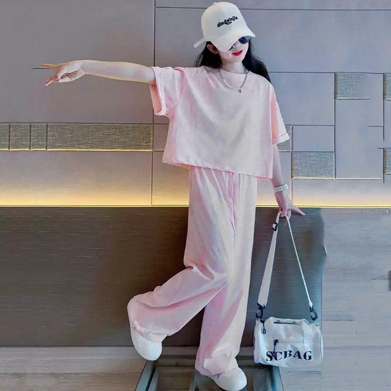 2025 夏の女の子のファッショントレンディなルーズカジュアルスーツ大きな女の子のためのピンクの西洋スタイル半袖ズボン 2 点セット