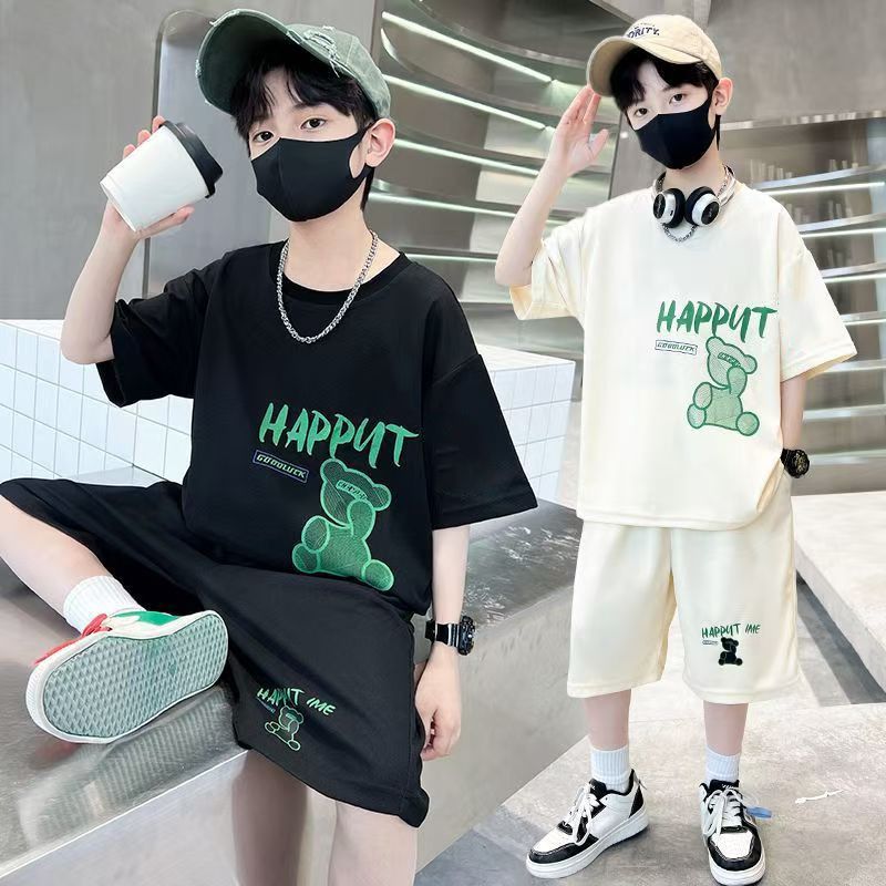 春の新型子供半袖ズボンセットの中の大きい男の子のアルファベットのプリントの外は丸首のレジャー運動のスーツを着ます。