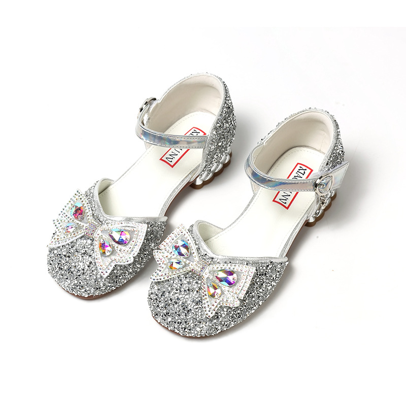 女の子の明るい王女の靴2023春の新型の子供の柔らかい底の靴の女の子は愛莎水晶の靴を演出します。