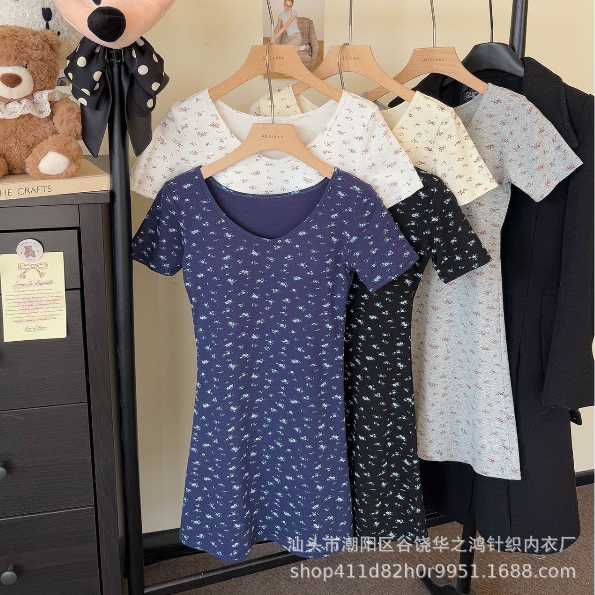 夏の新しいフレンチスタイルの半袖レトロ花柄ドレス、胸パッド付き、ウエスト痩身、小柄な人向けのショートスカート