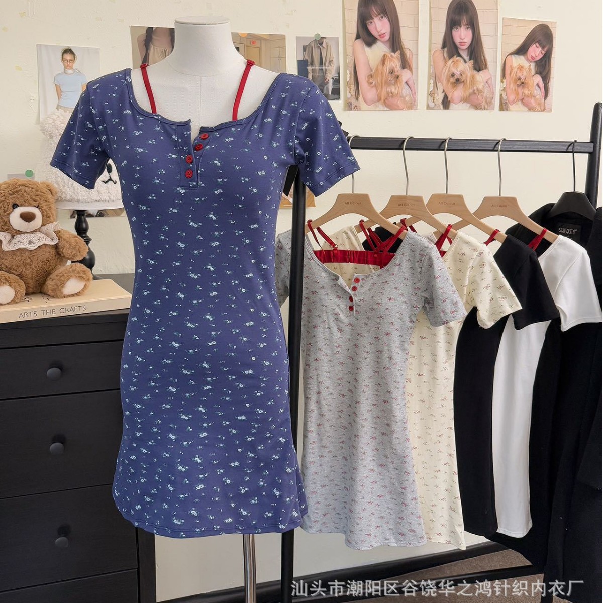 純粋な欲望スタイルの花柄半袖セータートップ女性のための夏の新しいデザイン偽ツーピース痩身トップ胸パッド付き