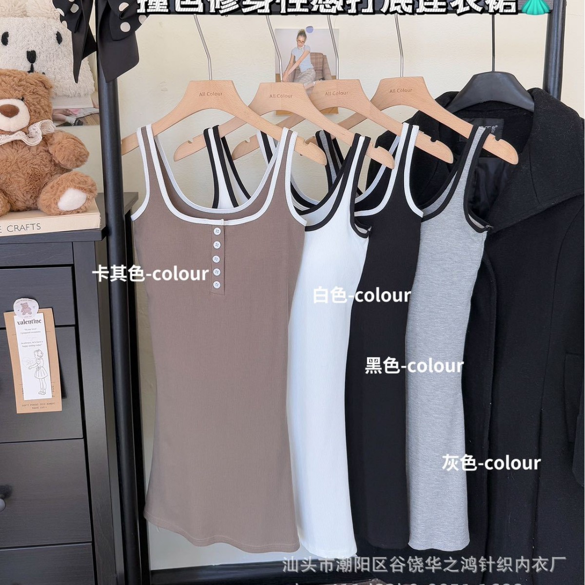 韓国風コントラストカラーボタンサスペンダードレスレディースヒップカバーノースリーブベスト胸パッド付きスリムホットガール万能ショートスカート