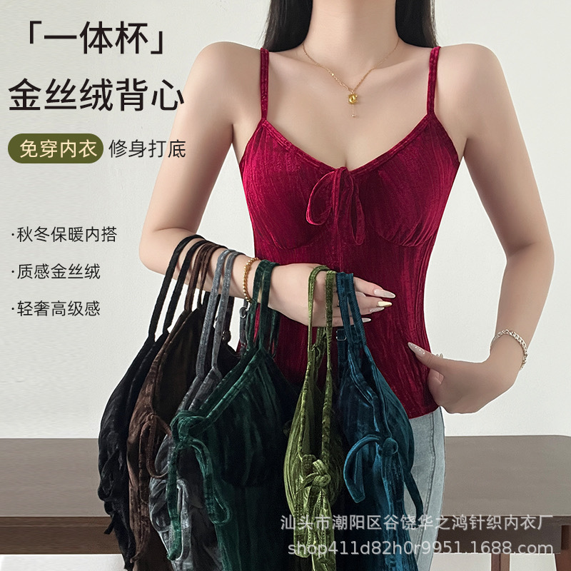 人気の高級ゴールドシルクシワベルベット暖かいキャミソール、胸パッド、ホルターネック、調節可能なショルダーストラップ、美しい背中付き