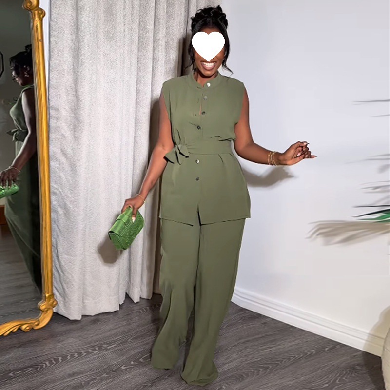 ヨーロッパとアメリカのクロスボーダー婦人服夏スタンドカラーボタンノースリーブウエストレースアップトップワイドレッグパンツスーツ