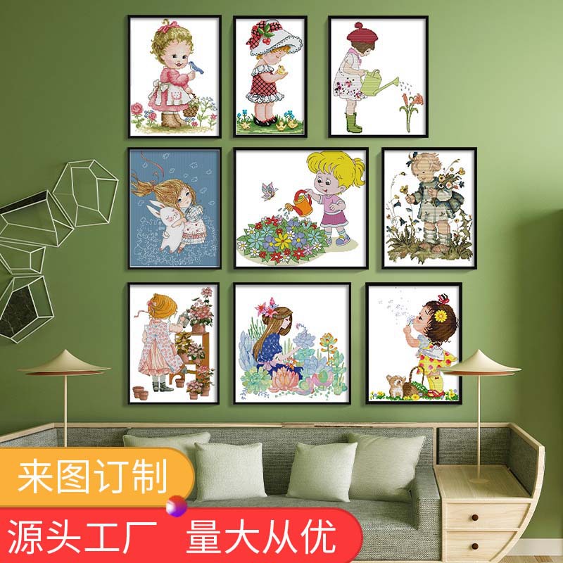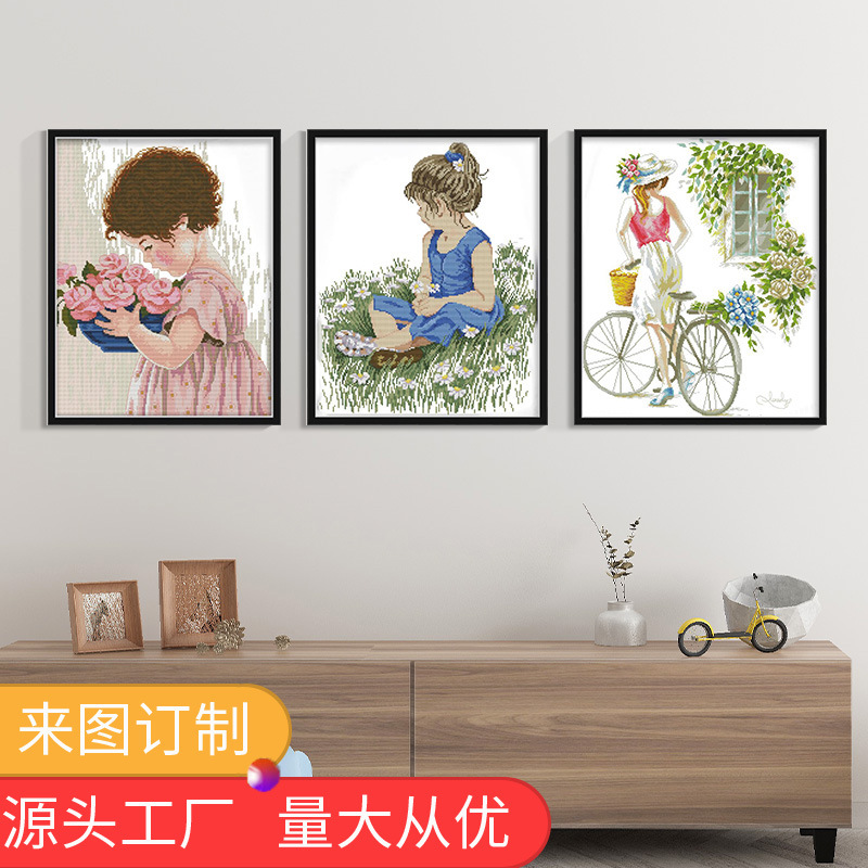 メーカー卸売りnkf新型十字刺繍人物芝生に花を持つ女の子diy刺繍糸刺繍材料が客間を包む