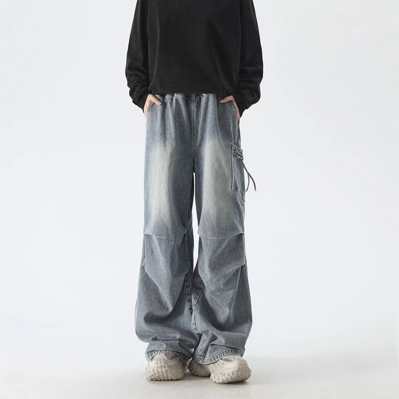 パンツメンズトレンディなウエストゴムジーンズメンズルーズストレートワイドレッグハイストリートアメリカンレトロプリーツポケットデザイン