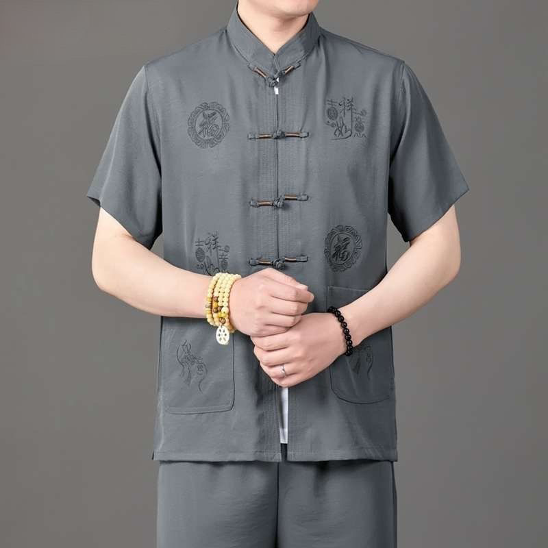 唐スーツ男性中高年お父さん夏服アイスシルク綿中国風おじいちゃん半袖中国風高齢者服ギフト新しいスタイル