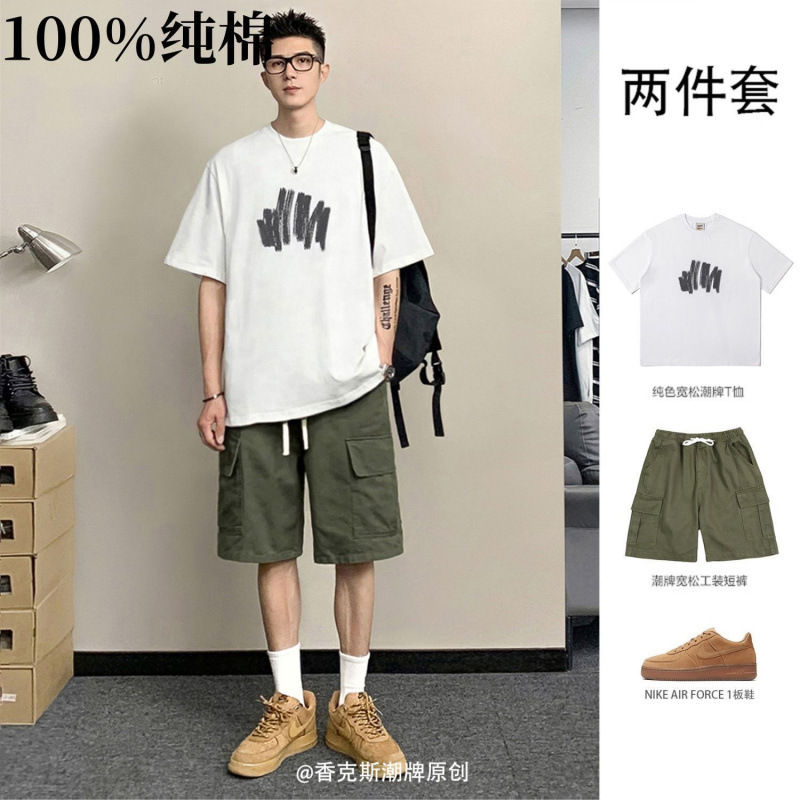 Wolf Warrior オリジナル ワーク ショーツ メンズ 夏 日本製 綿 100% 半袖 Tシャツ メンズ トレンド イン プリント 2点セット