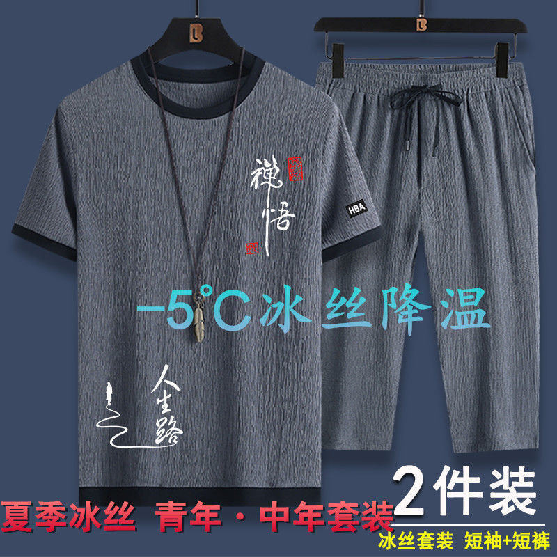 夏カジュアルスポーツスーツメンズ大きいサイズアイスシルク半袖Tシャツボーイズファッション新しい中国風の2点セット