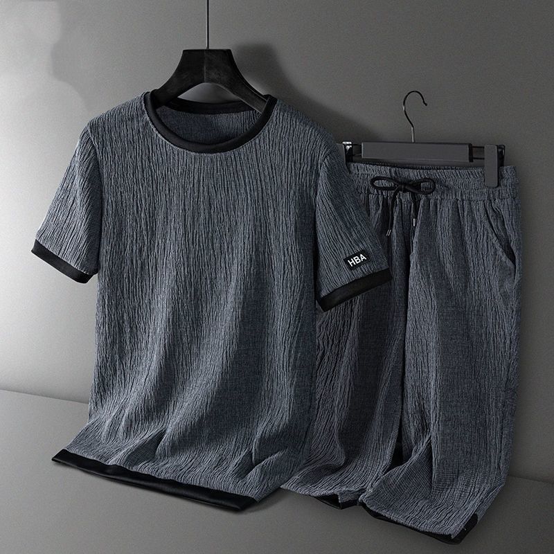 夏カジュアルスポーツスーツメンズアイスシルク半袖Tシャツクロップドショーツ2点セットゆったり大きいサイズコンプリートセット