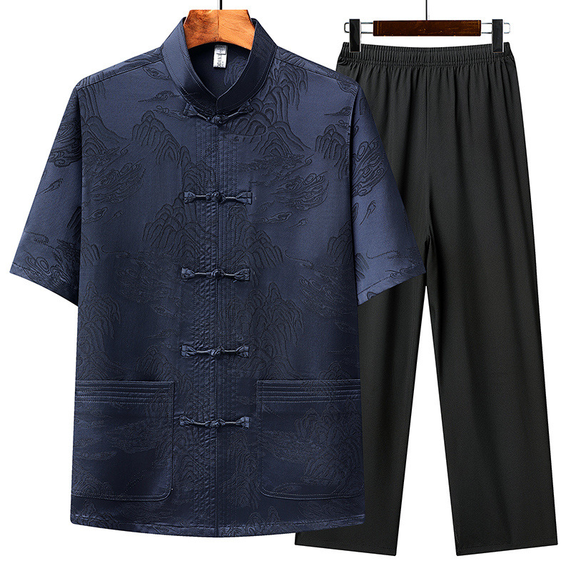 マルベリーシルク半袖唐スーツ中高年向け中国風おじいちゃん漢服お父さん夏カジュアル中国
