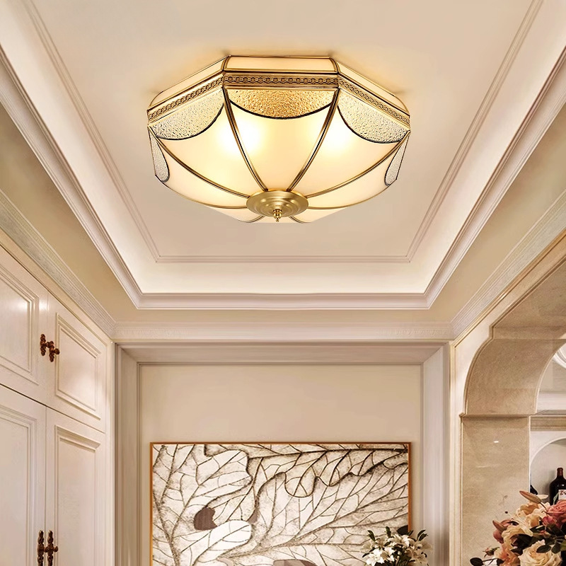 アメリカンシンプルなブロンズ寝室書斎ランプヨーロピアンスタイル玄関バルコニーラウンドレトロガラス全銅シーリングランプ