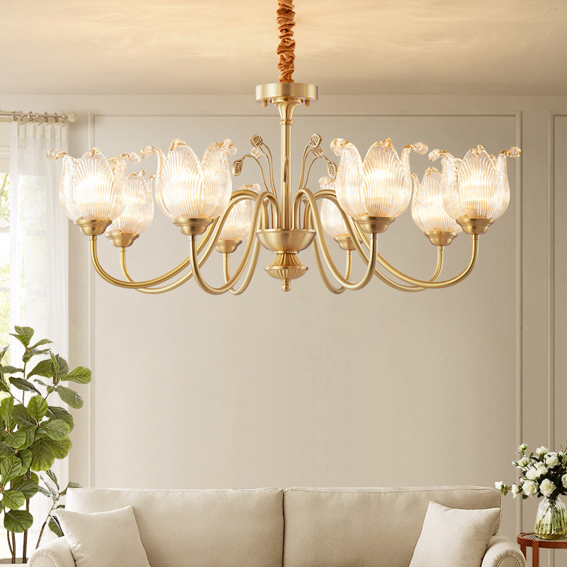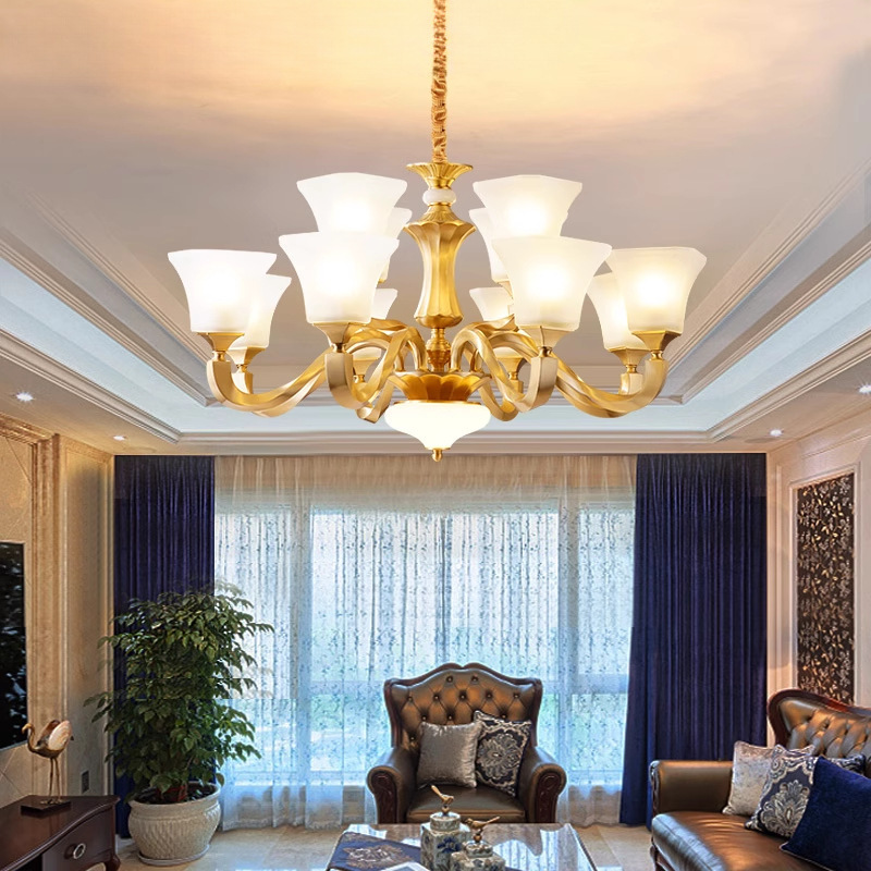 アメリカンブロンズヴィラ三階建てリビングルームランプシンプルモダンな連住宅雰囲気ガラスカバー全銅シャンデリア