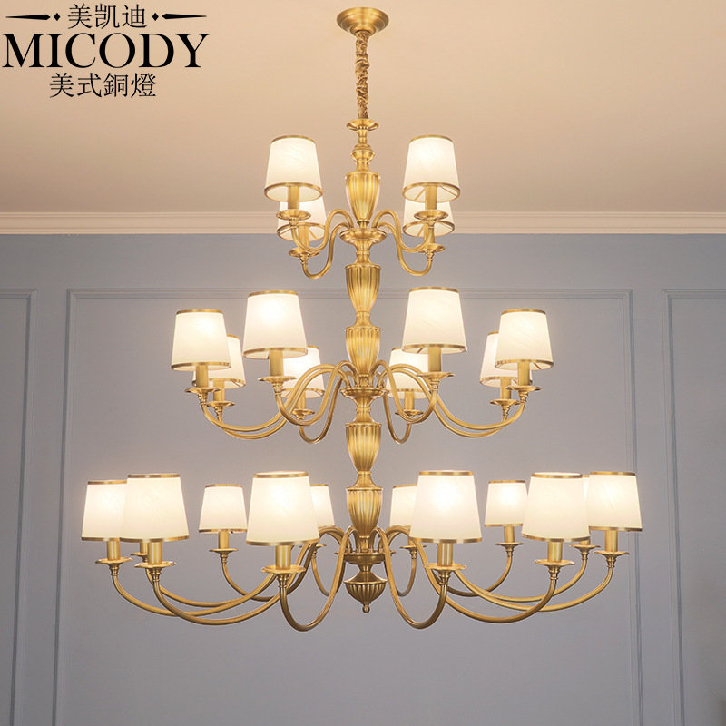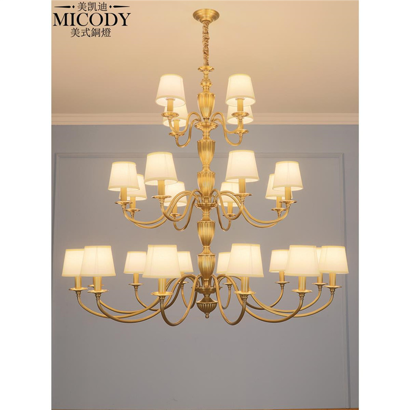 アメリカンブロンズヴィラ三階建てリビングルームランプ、シンプルモダンな連住宅、雰囲気のあるファブリックカバー、全銅シャンデリア