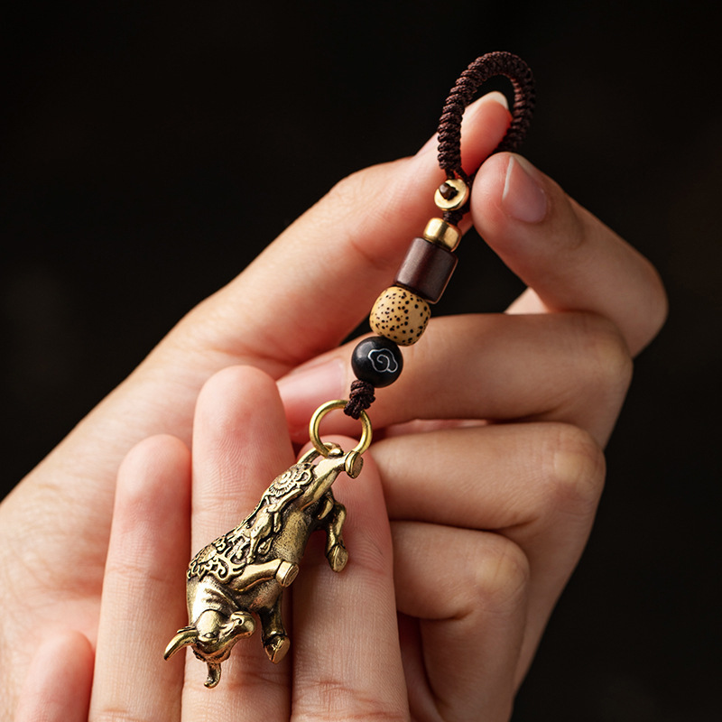 黄銅牛気天十二生肖牛属相自動車キーホルダーストラップレトロ手編みロープペンダント