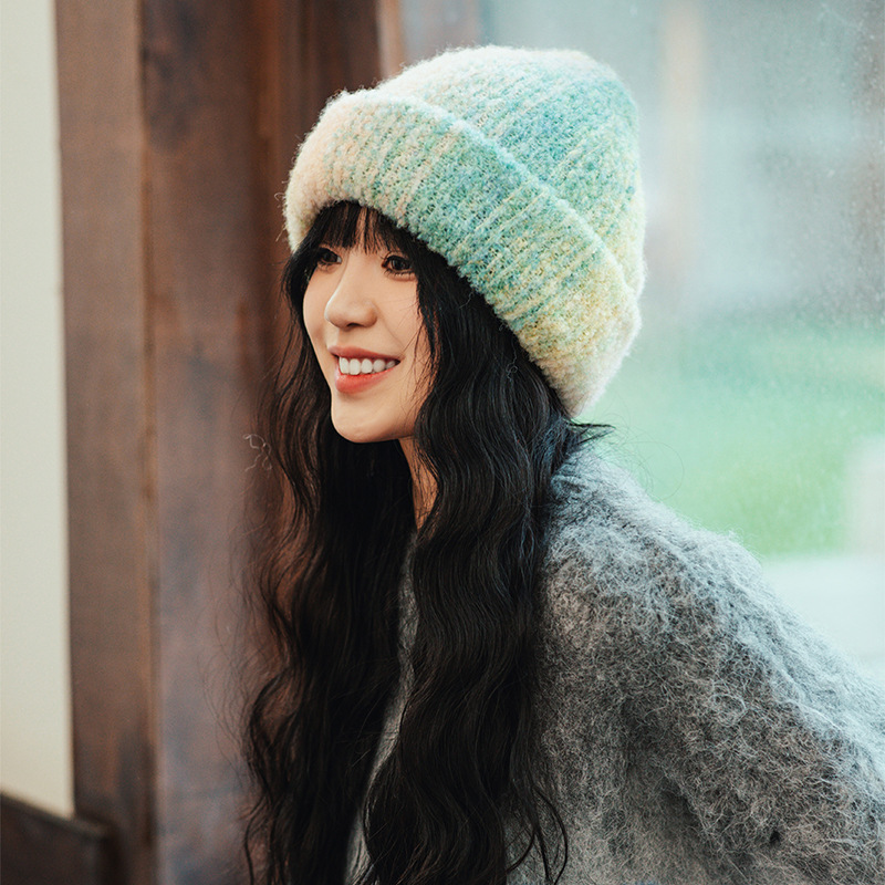 新しい秋冬に染めたグラデーション色のニット帽は保温して防寒します。