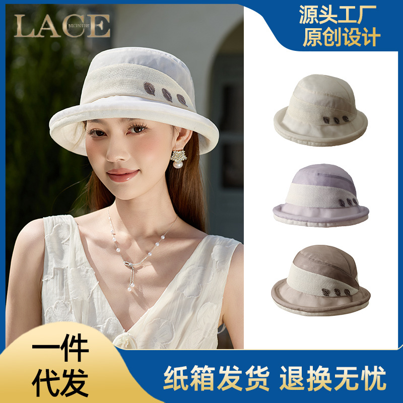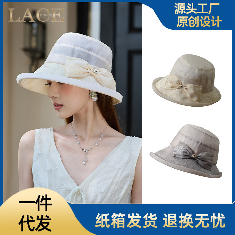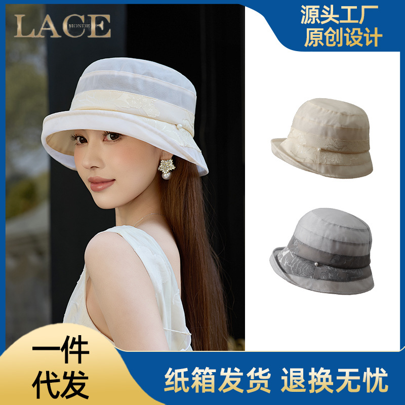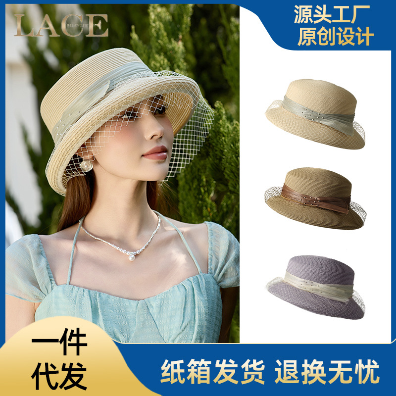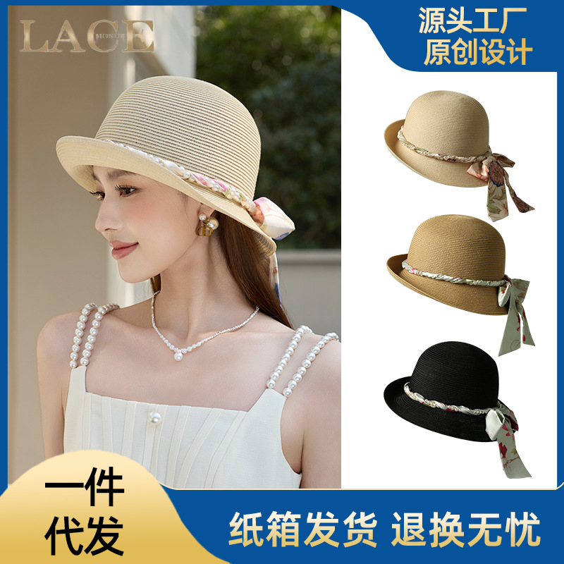 2025年春夏シルク麻取り外し可能なネットガーゼリボンパールサンハット女性用日よけ帽子麦わら帽子卸売