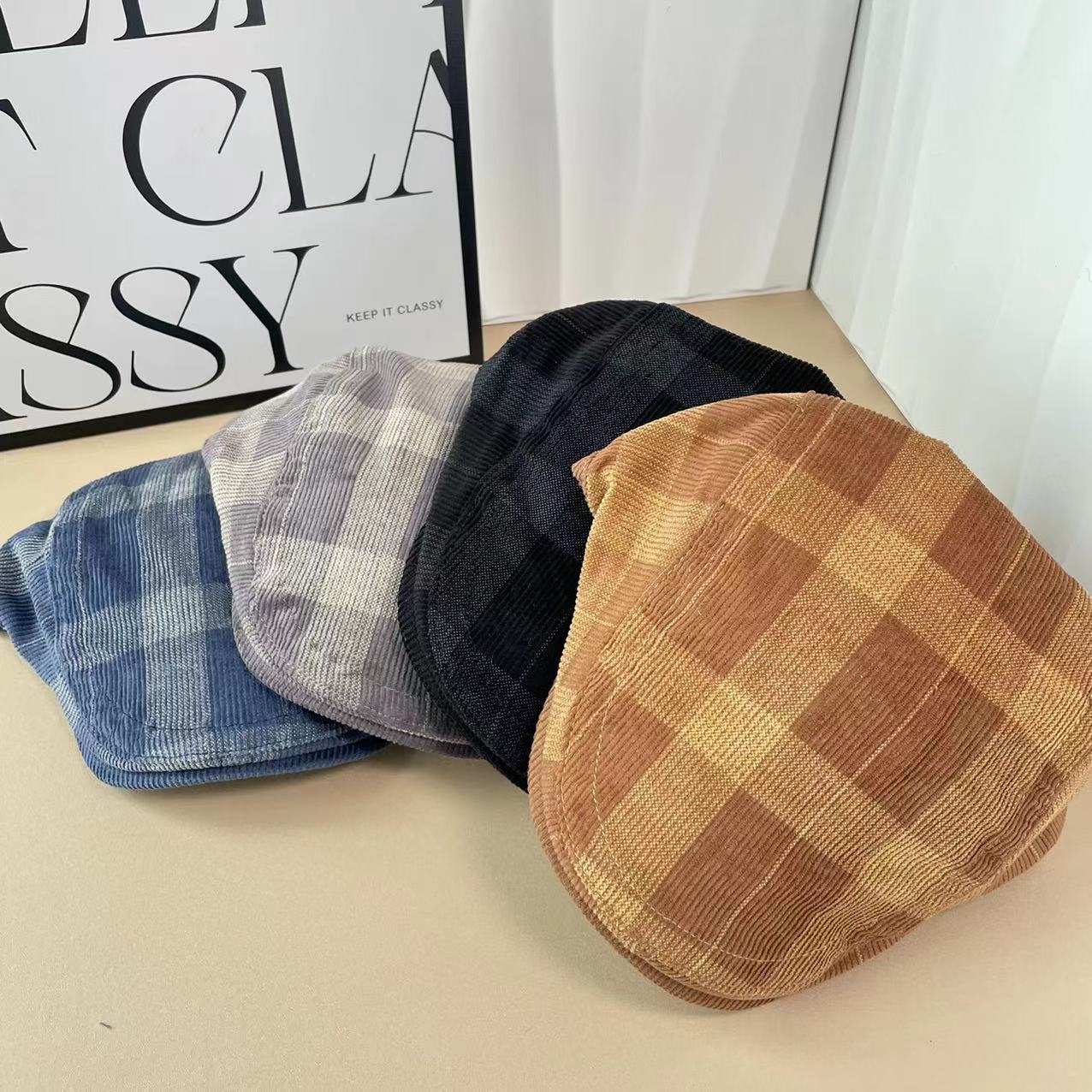 韓国のレトロな格子のコーデュロイのベレー帽の前進帽秋冬の新型の英倫風のアヒルの舌の帽子は百合で顔が小さいです。